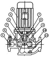 ISG立式管道泵結(jié)構(gòu)圖 | 1 | 取壓塞 | ISG型結(jié)構(gòu)說明: 1.泵與電機(jī)同端蓋,軸向尺寸縮短,結(jié)構(gòu)簡單。 2.泵體上設(shè)有取壓孔和放水孔。 3.泵體上設(shè)有排氣閥,工作前能拐車放泵內(nèi)空氣。 4.泵體底部設(shè)有安裝底板和螺栓孔,保證整體機(jī)組安裝穩(wěn)固。 |