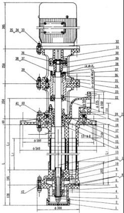 三、維修時(shí),先將泵從貯罐上拆下,拆下電機(jī)及機(jī)座,拆下下泵殼,打掉下軸套及葉輪(注意泵軸上防腐層)松開(kāi)上軸承座6只六角螺栓,然后把正條泵軸和軸承部件一起拉出即可進(jìn)行檢修。