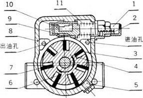 當(dāng)油槍橡膠關(guān)閉,電機(jī)仍驅(qū)動(dòng)葉片泵工作時(shí),葉片泵內(nèi)油壓將會(huì)隨之升高,為防止機(jī)件損壞,一旦油壓超過(guò)額定壓力時(shí),泵內(nèi)溢流閥自動(dòng)工作,泵內(nèi)腔油液自行經(jīng)葉片泵進(jìn)口孔進(jìn)油管流回油池(或油箱)內(nèi)。