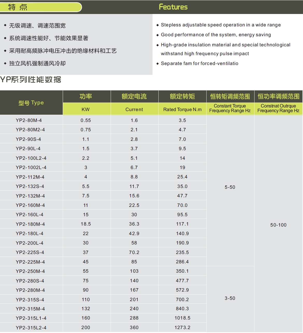 YVP/YVF系列電機,與傳統(tǒng)變頻電機相比較,具備更寬廣的調速范圍和更高的設計質量,經(jīng)特殊的磁場設計,進一步抑制高次諧波磁場,以滿足寬頻、節(jié)能和低噪音的設計指標。具有寬范圍恒轉矩與功率調速特性,調速平穩(wěn),無轉矩脈動。與各類變頻器均具有良好的參數(shù)匹配,配合矢量控制,可實現(xiàn)零轉速全轉矩、低頻大力矩與高精度轉速控制、位置控制及快速動態(tài)響應控制。YP系列變頻專用電機可配制剎車器,編碼器供貨,這樣即可獲得精準停車,和通過轉速閉環(huán)控制實現(xiàn)高精度速度控制。采用“減速機+變頻專用電機+編碼器+變頻器”實現(xiàn)超低速無級調速的精準控制。YP系列變頻專用電機通用性好,其安裝尺寸符合IEC標準,與一般標準型電機具備可互換性。