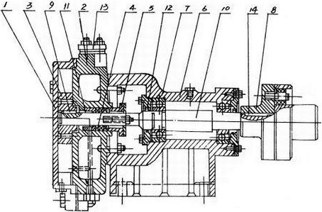 2 | 泵體 | 4 | 填料 | 6 | 托架 | 8 | 聯(lián)軸器 | 10 | 泵軸 | 12 | 軸承壓蓋 | 14 | 聯(lián)軸器平健 |