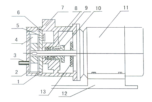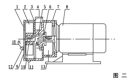 8、封液環(huán) 9、填料 10、填料壓蓋 11、電機(jī) 12、底盤 13、擋水圈