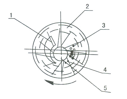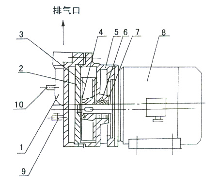 1、吸氣口 2、水環(huán) 3、排氣閥 4、排氣口 5、葉輪