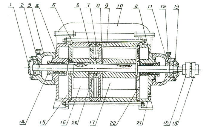 1、后軸承壓蓋 2、軸 3、軸承架 4、前后端蓋 5、短泵體 6、中間壁(B) 7、中間壁(A) 8、拉緊螺栓 9、長(zhǎng)泵體 10、連通管 11、調(diào)整墊 12、油杯 13、前軸承壓蓋 14、填料壓蓋 15、后蓋園盤 16、短葉輪 17、長(zhǎng)葉輪 18、泵聯(lián)軸器 19、電機(jī)聯(lián)軸器 20、軸套 21、進(jìn)水孔 22、前蓋園盤