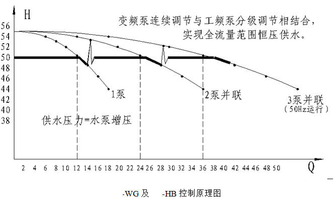 FX-WG、FX-H、FX-HB三種供水設(shè)備,是基于變頻泵的連續(xù)調(diào)節(jié)與工頻泵的分級調(diào)節(jié)相結(jié)合來實(shí)現(xiàn)全流量范圍的恒壓供水。控制原理圖如下所示: