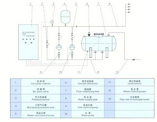 設備投入使用,自來水管網(wǎng)的水進入穩(wěn)流罐,罐內(nèi)空氣從真空消除器排出,待水充滿后真空消除器自動關閉。當自來水管網(wǎng)壓力和流量能夠滿足用水要求時,系統(tǒng)由旁通向用水管網(wǎng)直接供水;當自來水管網(wǎng)壓力不能滿足用水要求時,系統(tǒng)壓力信號由遠傳壓力表反饋給變頻控制柜,水泵運行,并根據(jù)用水量的大小自動調(diào)節(jié)轉(zhuǎn)速達到恒壓供水,若運轉(zhuǎn)水泵達到工頻轉(zhuǎn)速時,則啟動另一臺水泵變頻運轉(zhuǎn)。水泵供水時,若自來水管網(wǎng)供水量大于水泵流量,系統(tǒng)形成接力供水;用水高峰時,當自來水管網(wǎng)供水小于水泵流量時,穩(wěn)流罐內(nèi)的水作為補充水源仍能正常供水,此時,空氣由真空消除器進入穩(wěn)流罐,罐內(nèi)真空遭到破壞,確保了自來水管網(wǎng)不產(chǎn)生負壓;用水高峰過后,系統(tǒng)恢復到接力供水狀態(tài)。當自來水管網(wǎng)停水,造成穩(wěn)流罐內(nèi)液位不斷下降,液位探測器將信號反饋給變頻控制器,水泵自動停機,以保護水泵機組。