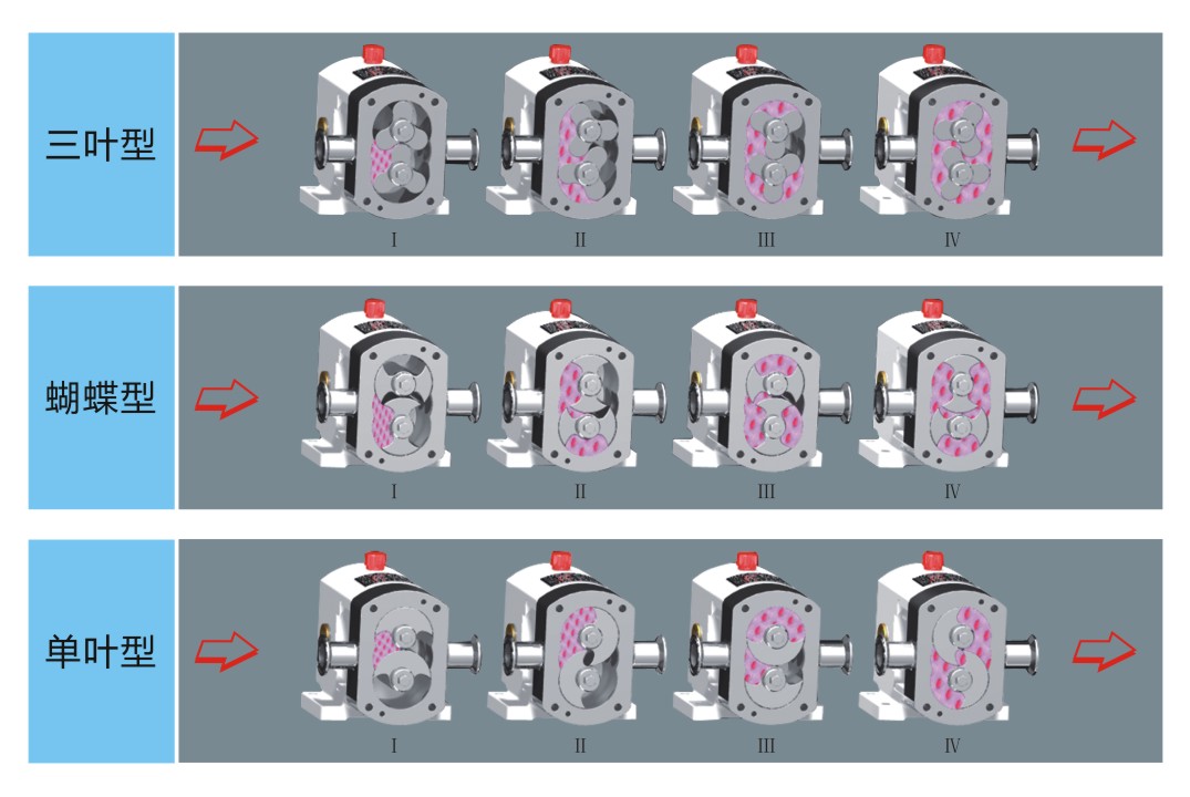 轉(zhuǎn)子泵又稱羅茨泵、膠體泵、高濃漿泵等,它依靠?jī)蓚€(gè)同步運(yùn)動(dòng)的轉(zhuǎn)子,由一對(duì)外置式同步齒輪箱進(jìn)行傳動(dòng),轉(zhuǎn)子在傳動(dòng)軸的帶動(dòng)下進(jìn)行同步反方向旋轉(zhuǎn),從而構(gòu)成了較高的真空度和排放壓力。兩轉(zhuǎn)子將轉(zhuǎn)子室分隔成幾個(gè)小空間,并按I-II-III-IV的次序運(yùn)轉(zhuǎn)。運(yùn)轉(zhuǎn)到I位置時(shí),只有進(jìn)口處充滿介質(zhì);運(yùn)轉(zhuǎn)到II位置時(shí),II室中封閉了部分介質(zhì);到位置時(shí),III室中也封閉了介質(zhì);到位置IV時(shí),進(jìn)口處和出口室相通,介質(zhì)即被輸送至出物料管道。按這樣的循環(huán)往復(fù),介質(zhì)即被不斷的輸送出去。